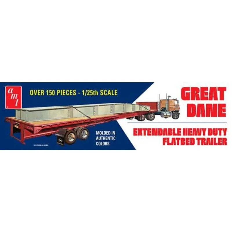 Great Dane uitschuifbaar plat bed 1/25 Schaal 1/25 Plastic model te monteren door lijmen en schilderen Witte en zwarte vormdelen Meer dan 150 onderdelen inclusief vinylbanden Aanhangwagenlengte verstelbaar van 40cm tot 78cm Inclusief decoratiebord Vintage stijl doos