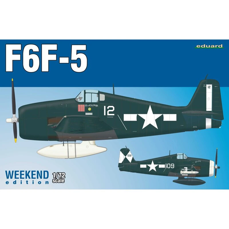 Grumman F6F-5 Hellcat Weekend editie kit van US WWII jachtvliegtuigen F6F-5 op schaal 1/72. – plastic onderdelen: Eduard – Aantal stickeropties: 2 – stickers: Eduard – PE-onderdelen: nee, – schildermasker: nee, – harsonderdelen: nee.