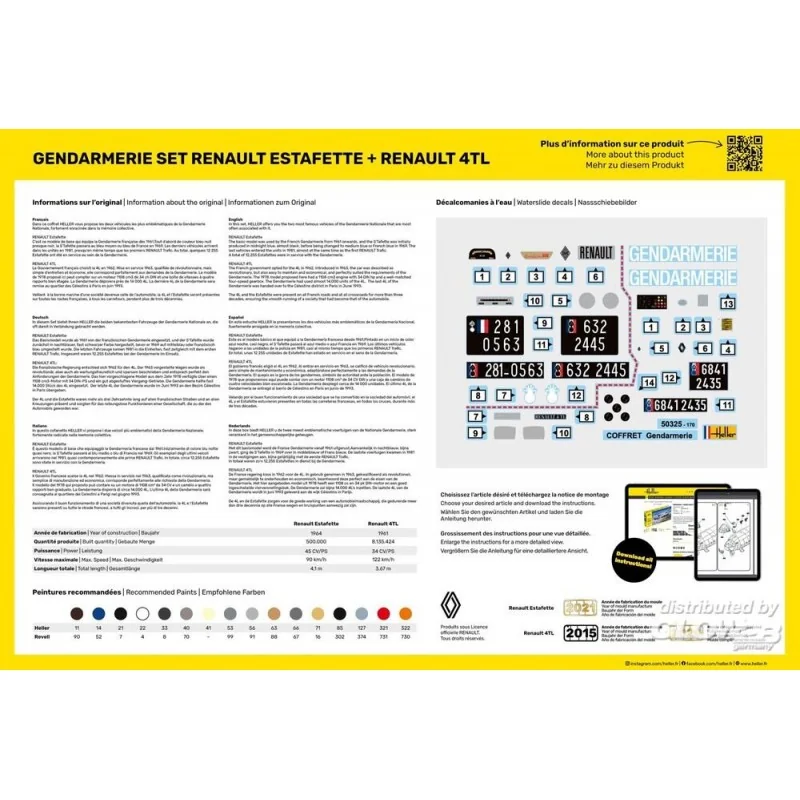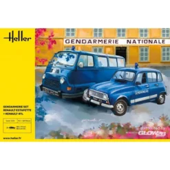 In deze doos biedt HELLER u de twee meest emblematische voertuigen van de Nationale Gendarmerie, sterk geworteld in het collectieve geheugen.RENAULT EstafetteHet is dit basismodel dat de Franse Gendarmerie vanaf 1961 uitrustte. Allereerst in nachtblauw, bijna zwart, de S’ Tafette zal in 1969 veranderen in middenblauw of blauw van Frankrijk. De laatste voertuigen arriveren in de eenheden in 1981, bijna tegelijkertijd met de eerste RENAULT Trafic. In totaal waren er zo’n 12.255 Estafettes in dienst bij de Gendarmerie.RENAULT 4TLDe Franse regering koos in 1962 voor de 4L. In 1963 in gebruik genomen, beschreven als revolutionair, maar gemakkelijk te onderhouden en zuinig, beantwoordde het perfect aan de eisen van het politiebureau. Het hier aangeboden model uit 1978 kan rekenen op een 1108 cc 34 pk DIN-motor en een goed getrapte vierversnellingsbak. De Gendarmerie zal bijna 14.000 4L’s inzetten. De laatste 4L van de Gendarmerie zal in juni 1993 in de Célestins-wijk in Parijs worden afgeleverd. Om ervoor te zorgen dat een samenleving die die van de auto is geworden goed blijft draaien, zullen de 4L en de Estafette aanwezig zijn op alle Franse wegen, op alle kruispunten , al meer dan drie decennia.