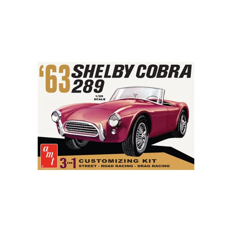 Deze Shelby Cobra 289 Roadster-mockup uit 1963 kan worden aangepast met veel onderdelen zoals : echt metalen inlaatkanalen, 289 kubieke inch motor, hardtop, GT stuurwiel, sleepgrille en benzinetank, tonneau cover, sleepbanden en nog veel meer opties! Deze kit bevat ook een enorm vel van 15 x 20 cm met kleurrijke emblemen boordevol opties en wordt geleverd in een nieuwe AMT-verpakking in vintage-stijl.